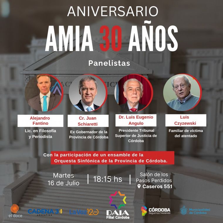 Los oradores principales serán el exgobernador, Juan Schiaretti; el presidente del Tribunal Superior de Justicia, Luis Eugenio Angulo; Luis Czyzewski, padre de una víctima del atentado y el periodista Alejandro Fantino.